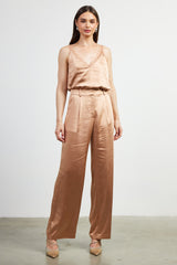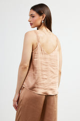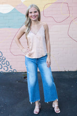 Slip into the Averie Lace Trim Satin Cami in Almond for a touch of effortless charm. With its silky satin fabric, playful lace trim, and flattering V-neck and back, this cami dances beautifully on your skin. The round hem adds a flirty finish, perfect for layering or wearing solo on sunny days. Embrace chic comfort with a fun twist!