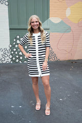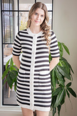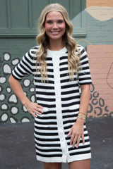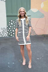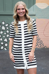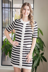Get ready to turn heads in the Ayla Button Front Knitted Dress. With its playful button front, round neck, and short sleeves, this mini length dress is both comfortable and stylish. The addition of front pockets and a striped design adds a fun and quirky touch!
