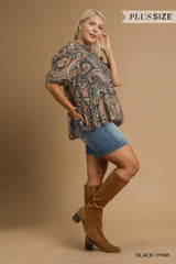 Embrace playful charm with the Bailey Printed Ruffle Hem Blouse in black and pink. Featuring a lively paisley print, half sleeves, and a flirty ruffled hem, this blouse adds a fun twist to your look. The tie neck detail lets you customize your style with a touch of whimsy, making it perfect for both casual days and dressy occasions. Designed for comfort, it lets you shine with confidence and effortless flair!