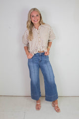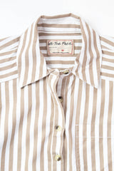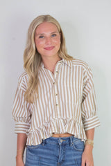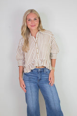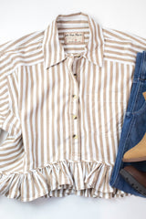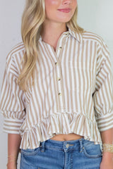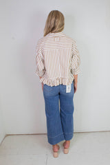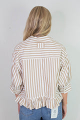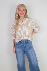 This playful Bailey Stripe Ruffle Hem Shirt brings a fresh twist to your wardrobe with its oversized fit and cropped length. Featuring a classic collar, button-down front, and a handy chest pocket, it combines style and function effortlessly. The charming ruffled hem adds a flirty touch, while the neutral stripe pattern keeps it versatile for any casual outing. Perfect for layering or wearing solo, this shirt is a fun way to brighten your everyday look!