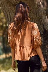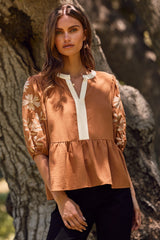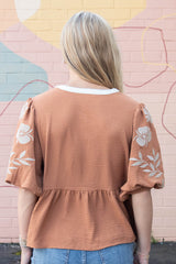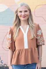 Bring a playful touch to your wardrobe with the Bella Embroidered Peplum Blouse in Mocha/Rust. Featuring charming half puff sleeves with delicate embroidery and a contrast split V-neck detailed with scalloped stitching, this blouse adds feminine flair to any look. The ruffled hem and peplum style create a flattering silhouette that dances with every move. Perfect for effortlessly stylish days, the Bella blouse pairs beautifully with jeans or skirts for a fun, flirty vibe!