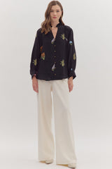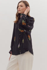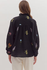 This semi-fitted Bethany Floral Embroidered Blouse in black features intricate floral embroidery and a delicate ruffle neck for a feminine touch. The button-front design and wrist button closures enhance its classic style, while the lined front provides comfortable coverage. Crafted from woven fabric with no stretch, this long-sleeve blouse offers a polished look perfect for elevating any outfit.