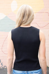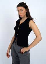 Elevate your wardrobe with the Blodwyn V-Neck Sweater Vest in sleek black, featuring eye-catching gold buttons for a dash of glam. This sleeveless style is perfect for layering or wearing solo when you want to show off your playful side. Whether dressed up or down, it adds a chic twist to any outfit!