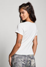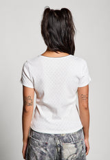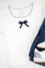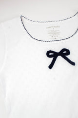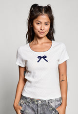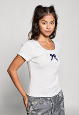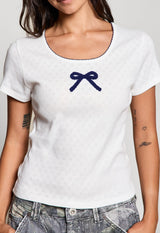 Add a touch of charm to your wardrobe with this playful navy blue top featuring a delicate blue bow embroidery. Crafted from soft heart pointelle knit, it offers a cozy feel and breathable texture. The contrast scalloped scoop neck and short sleeves add a flirty finish, making it perfect for casual days or layering under your favorite jacket. This graphic top brings a fun, feminine vibe to any outfit!