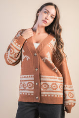 Embrace timeless style with the Bondurant Western Print Cardigan in camel. Featuring a relaxed fit and balloon long sleeves, this button-down cardigan combines comfort and classic flair. Crafted from thick fabric with moderate stretch, it offers cozy warmth without restricting movement—perfect for layering on cooler days. Add a distinctive touch to your wardrobe with this effortlessly stylish piece.