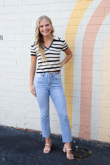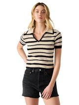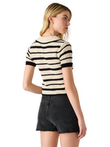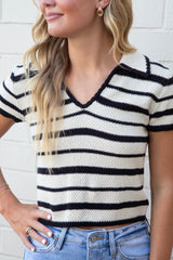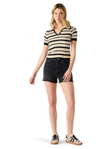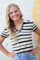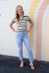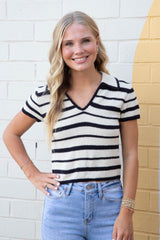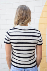 Add a splash of fun to your wardrobe with the Brayden Collared Striped Sweater in Black Multi. Featuring a playful mix of stripes, a chic collar, and breezy short sleeves with a flattering V-neck, this sweater is perfect for those who love style with a twist. Whether you're out with friends or just feeling fabulous at home, it’s your new go-to for effortless cool!