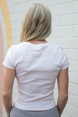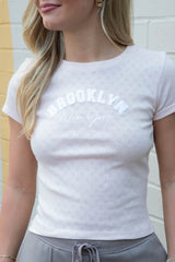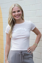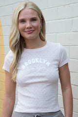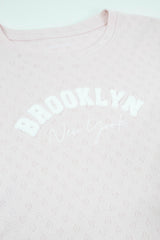 This playful Brooklyn NY Heart Pointelle Baby Tee in Peach Blush features fuzzy white embroidered lettering and delicate heart pointelle knit details for a soft, textured look. With short sleeves and a fun graphic design, it’s perfect for adding a cozy, cute vibe to your wardrobe!