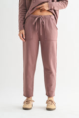 Slip into ultimate comfort with the Callie Tapered Lounge Pants in Midnight Navy. Featuring a playful tapered hem and raw edges for a relaxed vibe, these pants boast an elastic drawstring waist for the perfect fit every time. With handy side pockets, they're ready for all your lounging and lounging-imaginative missions. Cozy never looked so cool!