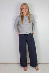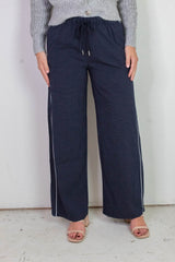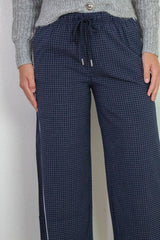 Step into style and comfort with the Calloway Check Woven Pants in Navy. Featuring a playful checkered pattern and bold contrasting side stripes, these pants bring fun to your everyday look. The elastic drawstring waist ensures a perfect fit, while handy side pockets keep your essentials close. Perfect for lounging or casual outings, these pants combine flair and function effortlessly!