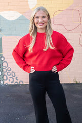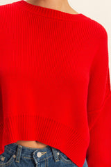 Add a pop of fun to your wardrobe with the Camila Round Neck Cropped Sweater in vibrant red. Featuring cozy long sleeves, a playful cropped cut, and flirty side slits, this sweater keeps you comfy and effortlessly stylish. Perfect for layering or rocking on its own, it’s your go-to for casual cool with a cheeky twist!