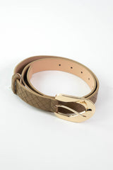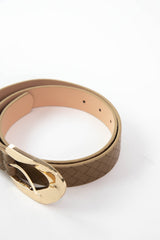 Upgrade your outfit with the Candace Metal Buckle Belt in mocha. Made of faux leather, this belt boasts a unique weave look and a stylish rounded gold buckle. Perfect for adding a touch of sophistication and playfulness to any outfit!
