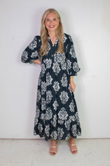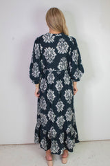 Embrace effortless charm with the Cecilia Boho Floral Midi Dress in navy. This playful dress features a flattering midi length, breezy three-quarter sleeves, and a split V-neck framed by delicate scalloped lace trim. The ruffled hem adds a flirty touch, while convenient side pockets keep essentials close. Perfect for sunny days or casual nights out, it’s a delightful blend of comfort and style