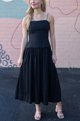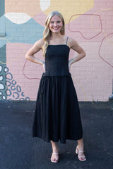 Turn heads in the Celeste Corset Lined Strapless Dress. The fitted bodice sculpts your silhouette while the strapless design lets you show off your shoulders with confidence. A flowy midi skirt adds movement and charm, and convenient side pockets give a fun, practical twist. Easy to wear with a back zipper closure, this black dress blends elegance with a playful edge perfect for any occasion!