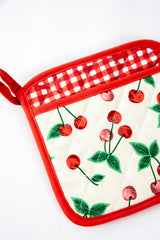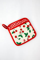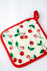 Yes, chef! Protect your hands from hot pans with this quilted pot holder with contrast piping, a pocket for your hand, and a corner loop for hanging!