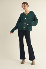 Wrap yourself in cozy charm with the Christina Chunky Knit Cardigan in hunter green. Featuring a round neck and long sleeves, it’s perfect for layering on chilly days. The standout large gold button closure adds a fun, stylish twist, while handy front pockets keep your essentials close. This cardigan blends comfort and flair for a look that’s effortlessly playful and warm!