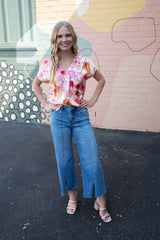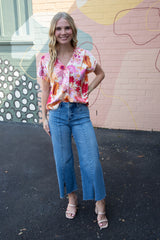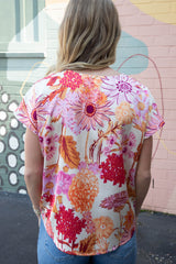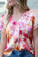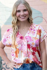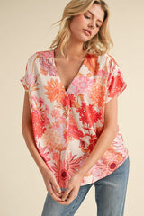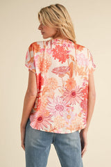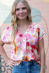 Brighten your wardrobe with our Christina Satin Flower Print Top! This playful orange and cream blouse features a flattering V-neck, elegant pleating, and comfortable short sleeves. The luxurious satin fabric adds a touch of sophistication while the vibrant floral pattern brings joy to any outfit. Perfect for sunny days or adding a pop of color to your everyday style!