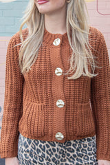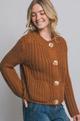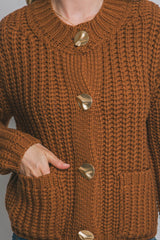 Stay cozy and chic in the Clara Gold Button Cardigan. This almond-colored beauty features chunky knit fabric that’s as soft as a hug, complete with fun gold buttons that add a pop of sparkle. With long sleeves, a comfy round neck, and handy front pockets, it’s your new go-to for layering in style and comfort. Perfect for those days when you want to feel snug but look fabulous!
