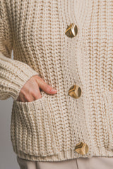 Stay cozy and chic in the Clara Gold Button Cardigan. This cream beauty features chunky knit fabric that’s as soft as a hug, complete with fun gold buttons that add a pop of sparkle. With long sleeves, a comfy round neck, and handy front pockets, it’s your new go-to for layering in style and comfort. Perfect for those days when you want to feel snug but look fabulous!