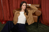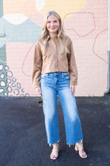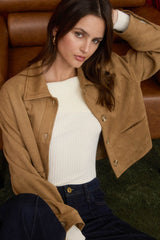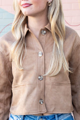 Elevate your style with the Cleo Suede Collared Jacket in camel. This playful cropped jacket features a soft faux suede finish, a classic button-down front, and handy front pockets for flirty functionality. Perfect for layering, it's the easygoing twist your wardrobe needs!