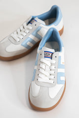 Step up your sneaker game with our Cloud Vintage Style Sneaker. Made with luxurious leather and a suede leather toe, these sneakers add a touch of sophistication to any outfit. The light blue accents and white laces add a pop of color, making you stand out from the crowd. Get ready to turn heads with this unique pair!