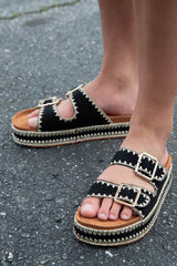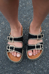 Slip into a touch of boho-chic with Cubana Whip Stitched Platform Sandals. The trendy micro suede and double buckle add playful flair, while the cushioned insole offers all-day comfort. Show off your unique style with these versatile and easy-to-wear slide-ons!