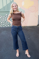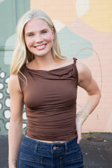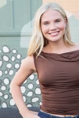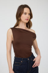 Delia Asymmetrical Off Shoulder Top, Chocolate