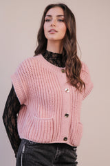 Stay cozy and cute with the Dorothea Chunky Button Down Sweater in blush. This playful, cropped knit features short sleeves, a round neck, and handy front pockets—perfect for keeping your essentials close while adding charm to any look. A fun twist on a classic button-down, it’s your go-to piece for easy style with a comfy, chunky texture!