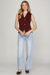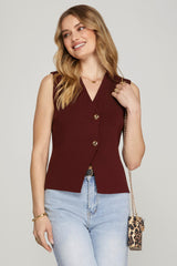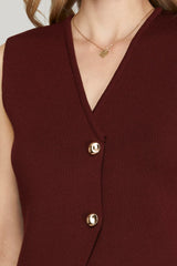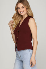 This sleeveless sweater vest in rich wine features shiny gold buttons that add a touch of sparkle to your outfit. The flattering V-neck and playful split hem make it perfect for layering or wearing solo on warmer days. Add a pop of color and charm to your wardrobe with this fun and stylish piece!