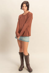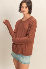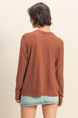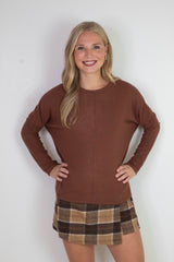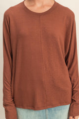 Bring cozy charm to your wardrobe with the Eliana Seam Front Top in warm Chestnut. Featuring a playful round neck and stylish seam front detail, this top adds subtle flair to everyday looks. The long sleeves keep you comfy and ready for anything from coffee dates to weekend outings!