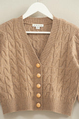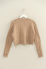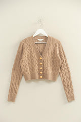 Cozy up in the Ellie Gold Button Cable Knit Cardigan! This taupe beauty features a playful cropped cut with a flattering V-neck and charming gold buttons down the front. Soft cable knit fabric and ribbed hems with snug cuffs keep you warm while adding texture and style to your outfit. Perfect for layering on breezy days with a touch of chic flair!