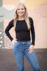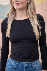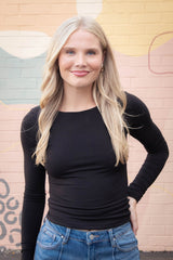 Stay cozy and chic in the Elowyn Double Layer Rib Knit Tee. Featuring playful long sleeves and a flattering boat neck, this black tee adds a touch of fun to your everyday look. The double-layered rib knit fabric keeps you comfy and stylish, perfect for layering or wearing solo on cooler days!