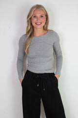 Stay cozy and chic in the Elowyn Double Layer Rib Knit Tee. Featuring playful long sleeves and a flattering boat neck, this heather grey tee adds a touch of fun to your everyday look. The double-layered rib knit fabric keeps you comfy and stylish, perfect for layering or wearing solo on cooler days!