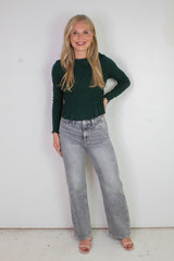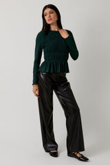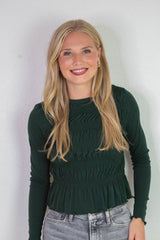 Add a touch of charm to your wardrobe with this Elsie top in dark green. Featuring a round neck, smocked bodice, and long sleeves, it blends comfort with a feminine flair. The playful ruffled hem adds movement and a fun finish, making it perfect for both casual outings and dressier occasions!