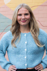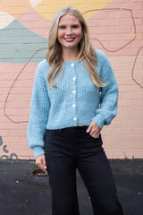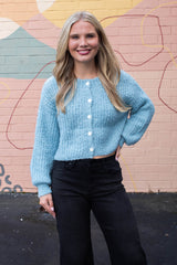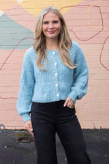 Stay cozy and cute with the Emberly Fluffy Knit Cardigan in Sky Blue. This playful piece features a charming round neck and button-down front for easy layering. Long balloon sleeves add a fun, voluminous twist, while the soft, fuzzy knit keeps you warm and snug. Perfect for chilly days when you want to feel wrapped in a cloud of comfort and style!