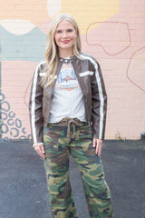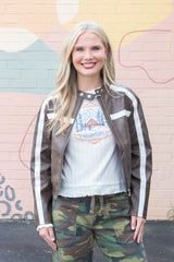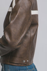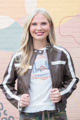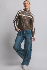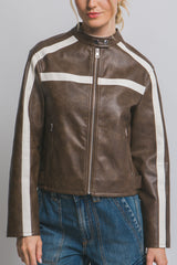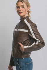 Step out in style with the Emery Contrast Stripe Jacket in rich brown faux leather. Featuring eye-catching ivory stripes, zipper pockets for your essentials, and a zip-up front with a button neck closure, this jacket blends edgy vibes with practical flair. Perfect for adding a playful twist to any outfit while keeping you comfy and confident!