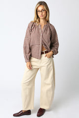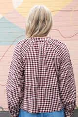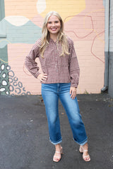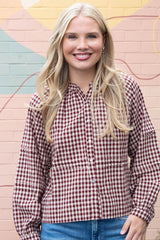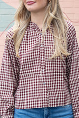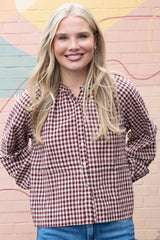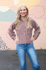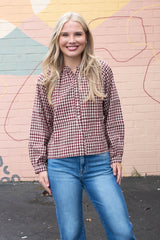 Bring a pop of playful charm to your wardrobe with the Emilia Checkered Shirt in Burgundy Taupe. Featuring long sleeves and a classic button-down style, it’s perfect for layering or wearing solo. The round neck and delicate pintuck details add a sweet twist, while the warm checkered pattern keeps things cozy and stylish. Whether paired with jeans or dressed up, this shirt is your new go-to for effortless fun and flair!