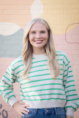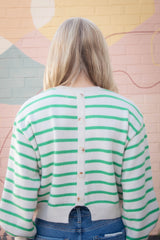 Meet your new favorite sweater: the Emily Striped Button Back Sweater in green. This playful cropped top features fun faux button details down the back, long sleeves for cozy comfort, and a classic crew neckline that pairs perfectly with everything. Stylish stripes bring a lively touch to any casual outfit, making it an easy pick for days when you want to look cute without trying too hard!