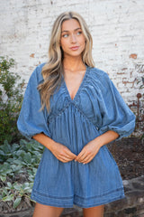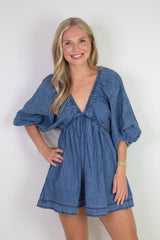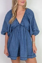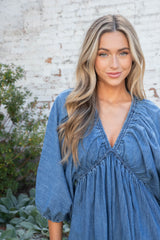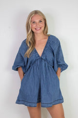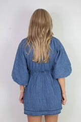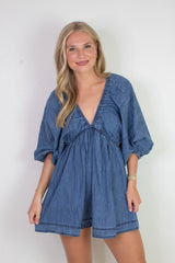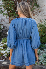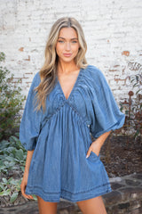 This playful Emry Puff Sleeve Denim Dress is both stylish and functional. With its elastic waist and hidden side pockets, it offers comfort and convenience. The v-neck and puff sleeves add a touch of femininity, making it the perfect mini dress for any occasion!