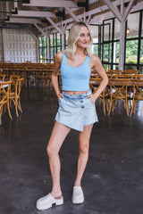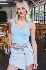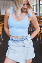 Flaunt your unique style with the Esther Sleeveless Crop Top! This sky blue top features a playful combination of a sleeveless design and a cropped length, perfect for showing off your personality. The crew neckline adds a touch of quirkiness, making this top a must-have for any fashion-forward individual.