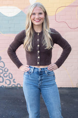 Meet your new favorite layer: the Eva Collared Cropped Cardigan in warm brown. With its chic collar, playful gold buttons, and handy chest pockets, it adds a dash of fun to any outfit. The long sleeves and ribbed hem with cuffs keep you cozy, while the cropped cut shows off your style without hiding your favorite high-waisted pieces. Perfect for mixing and matching with your wardrobe’s best!