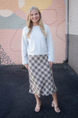 Step out in style with the Evangeline Tartan Plaid Flowy Midi Skirt in charcoal. This playful skirt features a flattering elastic waist for comfort and a breezy, flowy design that moves with you. Its midi length strikes the perfect balance between chic and easygoing, making it ideal for both casual outings and dressier adventures. Add a touch of classic plaid charm to your wardrobe with this effortlessly cool piece!
