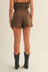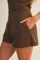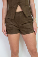 Step into the season with the Everly High Waist Suede Shorts in Dark Oak! These playful shorts hug your waist with a flattering high-rise fit, while the soft suede fabric adds a touch of luxe texture. Seam details give them a chic, tailored edge, and the zipper with hook closure ensures a secure, comfortable fit for everyday adventures. Elevate your wardrobe with a dash of flair and undeniable charm!