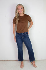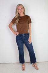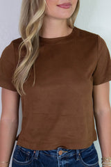 Elevate your style with the Ezra Faux Suede Top in Chicory Coffee. This playful cropped design features a soft faux suede finish, a flattering round neck, and breezy short sleeves. Side slits add a fun twist, while the back zipper closure ensures a perfect fit. Perfect for mixing and matching with your favorite pieces!