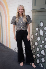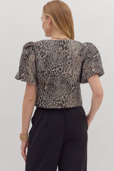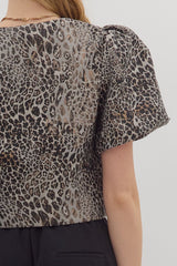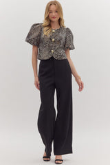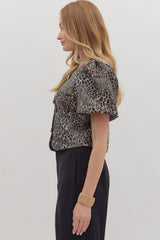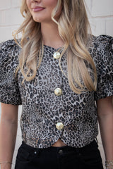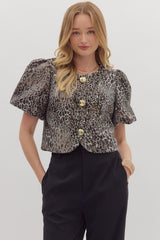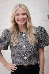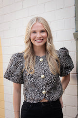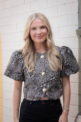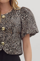 Add a wild twist to your wardrobe with the Faye Puff Sleeve Leopard Jacket. Featuring playful short puff sleeves and a bold leopard print, this cropped jacket with gold button detail is perfect for turning heads and embracing your fierce side!