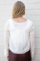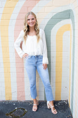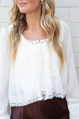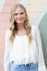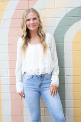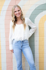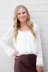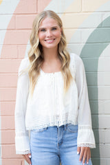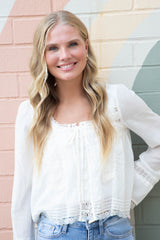 The Forevermore Long Sleeve Top in Ivory is a playful blend of delicate lace trim and charming pintuck details. Its scoop neck and button-down front are topped with a flirty tie, making it perfect for adding a touch of whimsy to your wardrobe. Light, feminine, and effortlessly stylish, this top is ready to brighten your day!