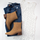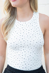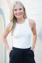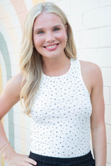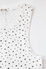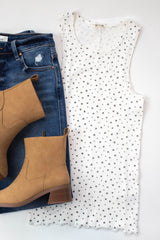 Embrace a playful vibe with this sleeveless top featuring a tiny black floral print on a soft ivory background. The scoop neck and delicate pointelle knit details add a touch of charm, while the lettuce hem brings a flirty, fun finish. Perfect for sunny days and casual outings, this top keeps your look fresh and effortlessly cute!