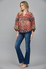 Elevate your wardrobe with the Freya Ruffled Blouse in a stunning multi-color design. Featuring a flattering ruffled V-neck and flowy, elastic-cinched sleeves, this blouse offers a relaxed fit for effortless comfort. The subtle metallic gold thread detail adds a touch of elegance, while the lined chiffon fabric ensures a soft, lightweight feel without stretch. Finished with a convenient front button closure, it’s perfect for both polished office looks and casual outings. Experience style and ease in one beautiful top.