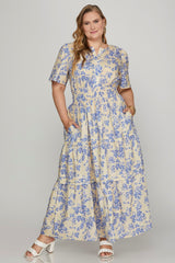 The Gemma Tiered Floral Maxi Dress in blue is a playful blend of style and comfort. Featuring charming pintuck details and a vibrant floral print, it’s designed with short sleeves and a flattering elastic waist for easy movement. The split neck adds a flirty touch, while side pockets keep essentials close. With its flowing maxi length, this dress is perfect for sunny days!