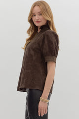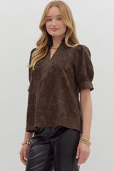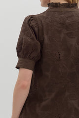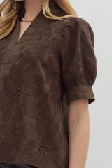 This playful blouse features delicate floral embroidery and charming puff short sleeves that add a touch of whimsy. The ruffled split V-neck and eyelet details create a flirty, feminine look perfect for sunny days and casual outings. Embrace effortless style with this brown beauty!
