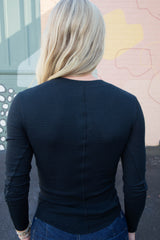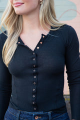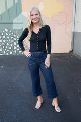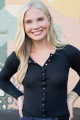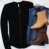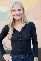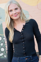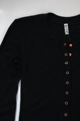 This playful black cardigan features a button-front design and a cozy round neck, perfect for layering on any adventure. With long sleeves and seam-detailed sides, it adds a subtle touch of style while keeping you comfortably chic wherever you’re going!